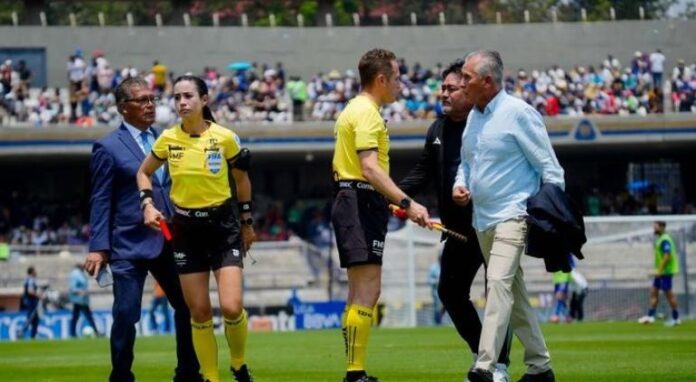 El incidente ocurrió tras el final del primer tiempo, cuando el técnico fue expulsado luego de reclamar decisiones arbitrales en el duelo correspondiente a la Liga MX.