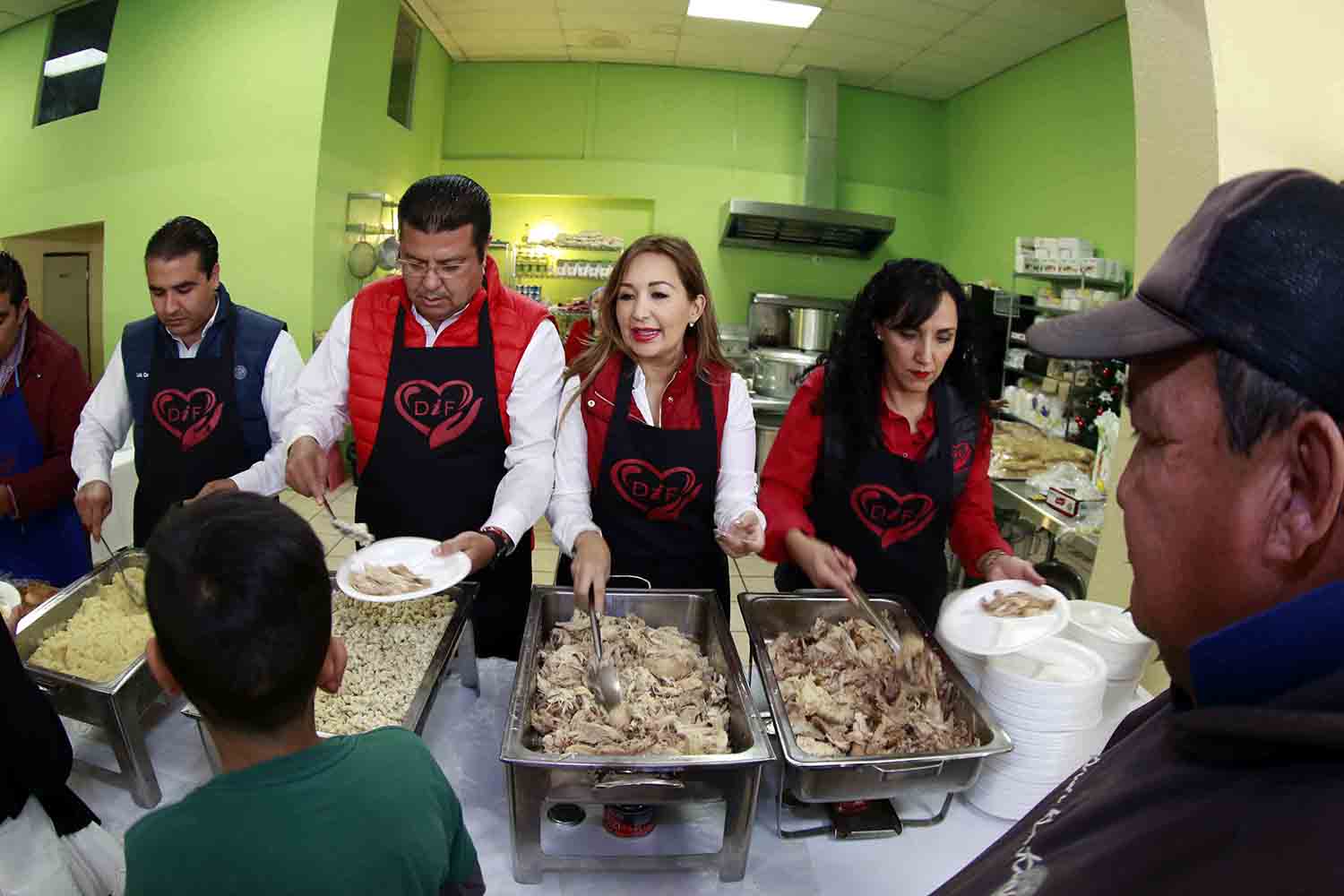 El alcalde Armando Cabada Alvídrez y su esposa, la presidenta del Sistema Municipal para el Desarrollo Integral de la Familia (DIF), Alejandra Cabada, se colocaron un mandil cada uno y se colocaron, acompañados de funcionarios de la Secretaría de Desarrollo Social Federal (SEDESOL) y del municipio, detrás del mostrador donde se ubicaron los recipientes que contenían pavo, puré de papa ensalada, que comenzaron a repartir entre los asistentes.