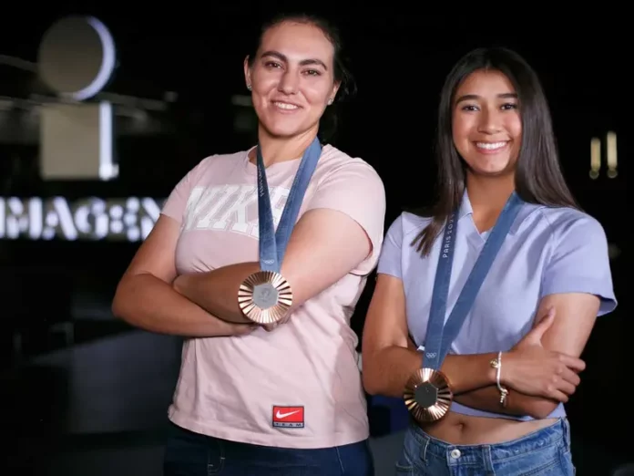 Alejandra Valencia y Ángela Ruiz portaron con orgullo la medalla de bronce que obtuvieron en tiro con arco por equipos de París 2024. Fotos: Daniel Betanzos.