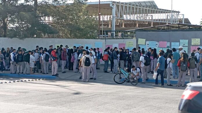 Un grupo de 7 alumnos se encuentra bloqueando la entrada principal del plantel II del Conalep, mientras que una multitud de estudiantes se congrega a las afueras de la institución en espera de una resolución.