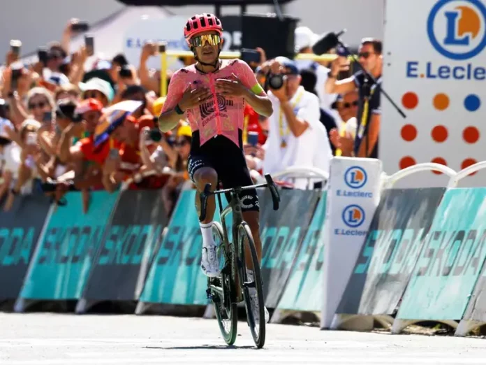 La historia de éxito del ecuatoriano empezó a escribirse en el kilómetro 168 cuando primero alcanzó a Simon Yates a tres kilómetros de la cima de Col du Noyer, uno de los puntos críticos del recorrido de la jornada para, a partir de ahí, tomar el liderato que le permitió ganar por 37 segundos a Yates (Jayco-AlUla) y por 57 segundos a Enric Mas (Movistar).