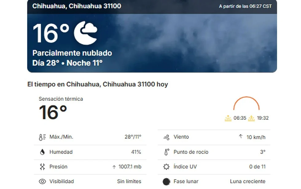 De acuerdo al portal del clima The Weather Channel, la ciudad de Chihuahua amaneció este sábado a 16 grados centígrados con cielo parcialmente nublado.