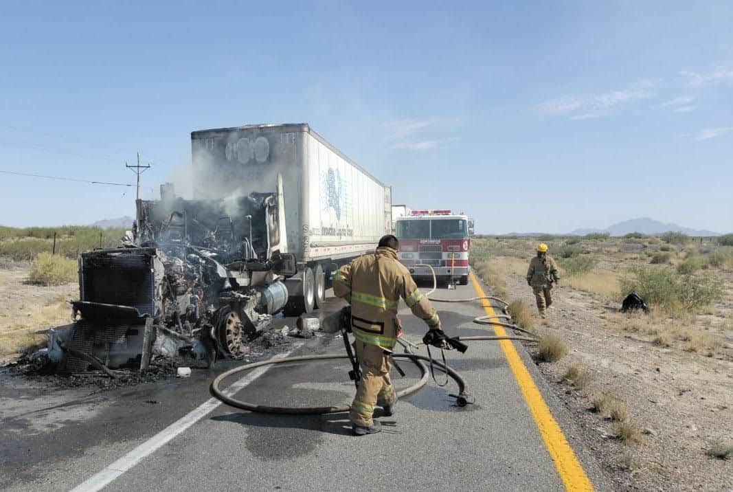 Elementos de la Guardia Nacional cerraron el sentido norte a sur de la carretera Ciudad Juárez-Ahumada, debido al incendio en la cabina de un tractocamión, ocurrido a la altura del kilómetro 260, informó la Coordinación Estatal de Protección Civil (CEPC).