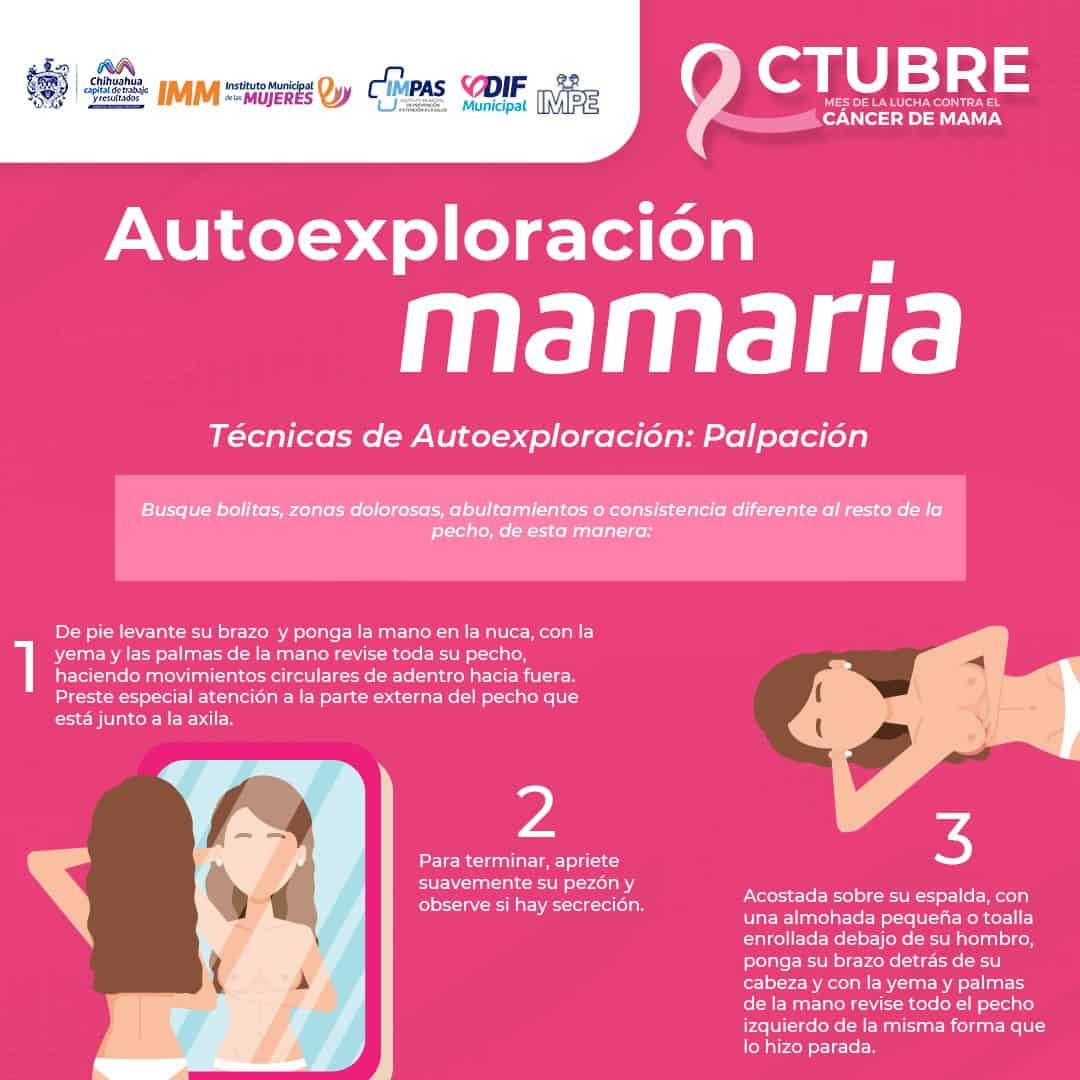 Con el fin de fomentar la detección temprana del cáncer de mama, el Gobierno Municipal de Chihuahua, a través del Instituto Municipal de Prevención y Atención a la Salud (IMPAS), emite la forma con la que pueden realizar exploraciones en sus mamas desde casa.
