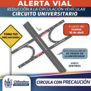 Chihuahua, Chih., a 17 de abril de 2024.- Derivado de las intervenciones que se realizan en el Circuito Universitario, el director de Obras Públicas, Rodolfo Armendáriz, exhortó a la ciudadanía a tomar en cuenta algunas recomendaciones viales como, circular con precaución por la zona, viajar a velocidad moderada, respetar los señalamientos y tomar más tiempo de anticipación al momento de su salida.