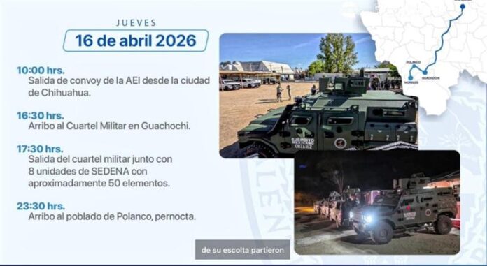 10:00 horas: Sale de la ciudad de Chihuahua un convoy de la AEI integrado por aproximadamente 40 elementos en 16 unidades.