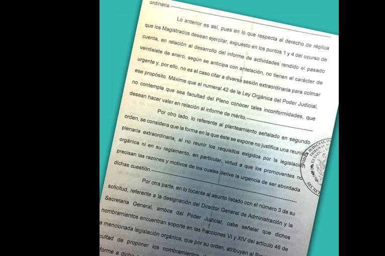 El oficio aparece firmado por los magistrados José Alfredo Fierro Beltrán, Otilia Flores Anguiano, Miriam Victoria Hernández Acosta, Delia Holguín López, Jorge Abraham Ramírez Alvídrez, César Fernando Ramírez Franco, Gabriel Armando Ruiz Gámez, Gabriel Humberto Sepúlveda Reyes, Eduardo Filiberto Terrazas Padilla y Luis Villegas Montes.