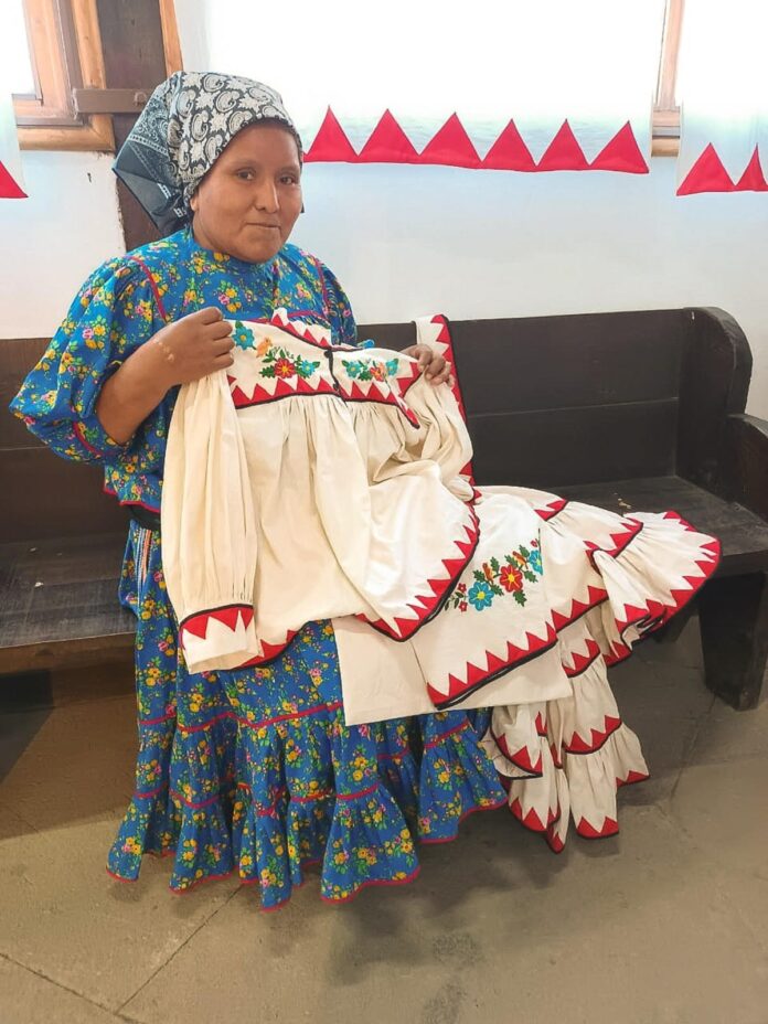 En esta ocasión la pieza que participó consta de un traje tradicional rarámuri completo con accesorios como: faja, collera y joyería; la indumentaria cuenta con diseños bordados y completamente confeccionada a mano.