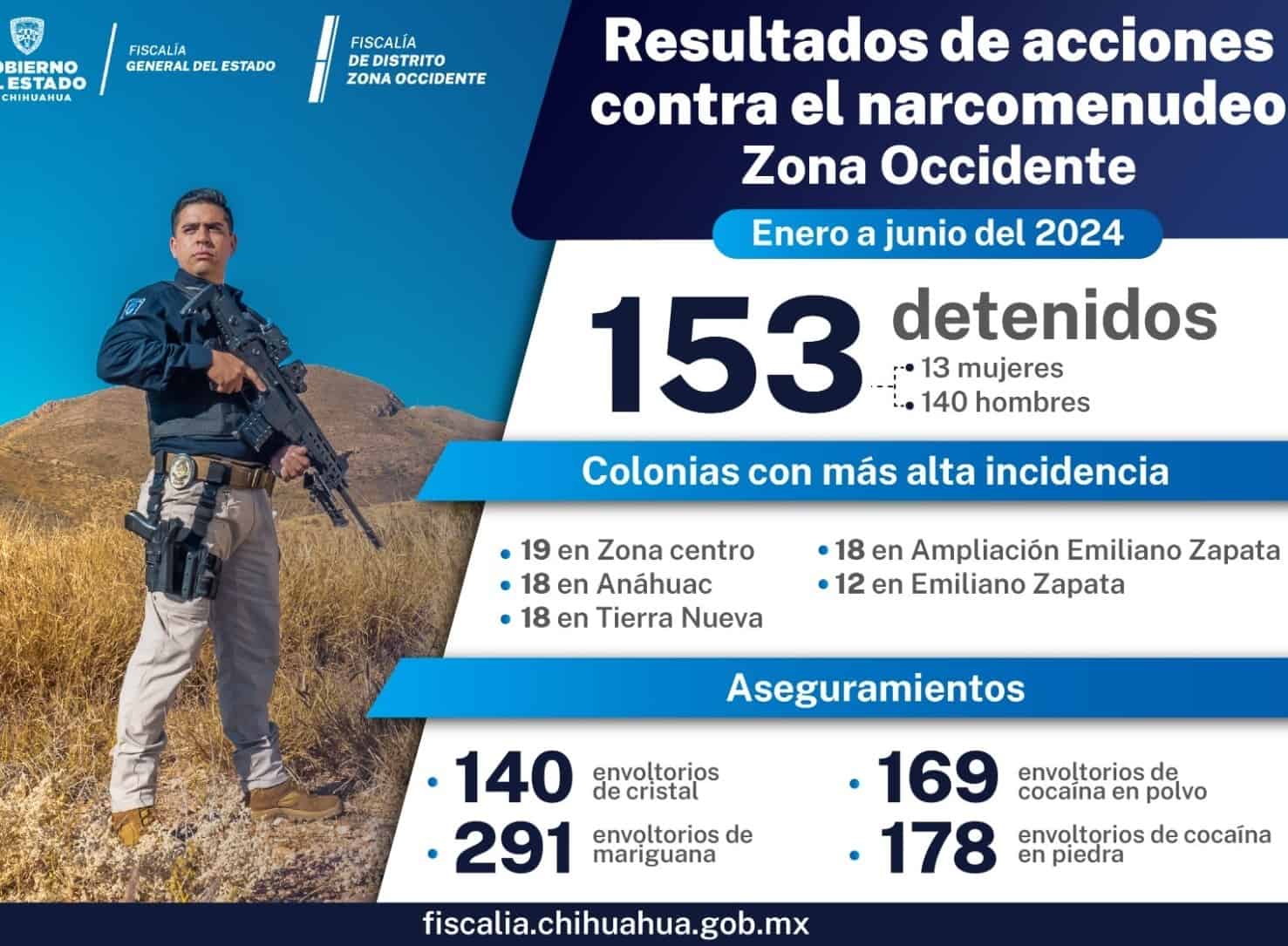 El reporte que corresponde al periodo de enero a junio del 2024, indica también que son 118 carpetas de investigación las que se han integrado por delitos contra la salud por la detención de las 153 personas.