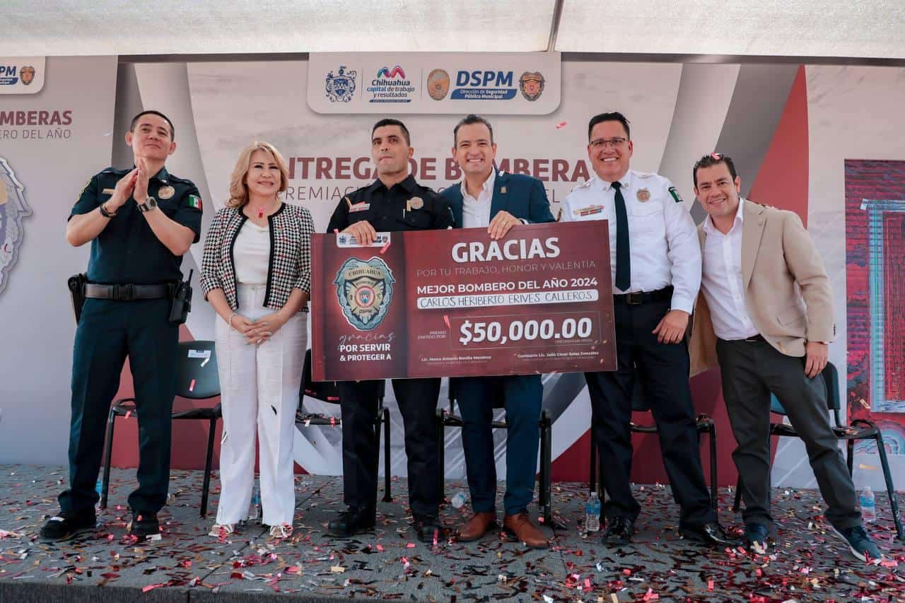 Como parte de la ceremonia y en el marco del “Día del Bombero”, que se celebra el 22 de agosto, Marco Bonilla dio a conocer el nombre del elemento que ganó el premio “Bombero del Año”, el cual se le otorgó al agente Carlos Heriberto Erives Calleros, quien recibió de manos del Alcalde y el jefe de la Policía, Julio César Salas, un cheque por la cantidad de 50 mil pesos.