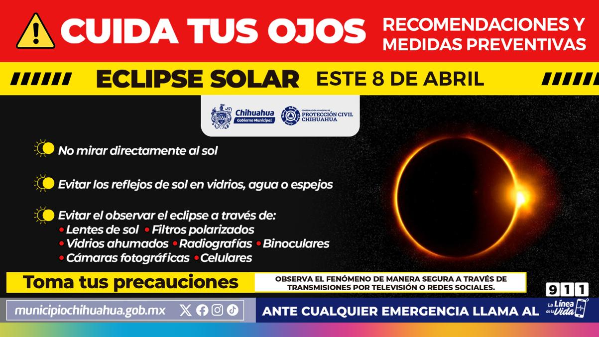 Chihuahua, Chih. A 8 de abril de 2024.- El Gobierno Municipal de Chihuahua exhorta a la población en general a resguardarse y tomar las debidas precauciones hoy 8 de abril, ante el evento extraordinario del eclipse solar que se presentará y que podría tener implicaciones en la salud por la radiación que emite este fenómeno.