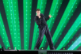 Con gabardina negra y camisa amarillo brillante que hacía juego con el vestuario de la docena de bailarines y bailarines que lo acompañan, apareció en el escenario.