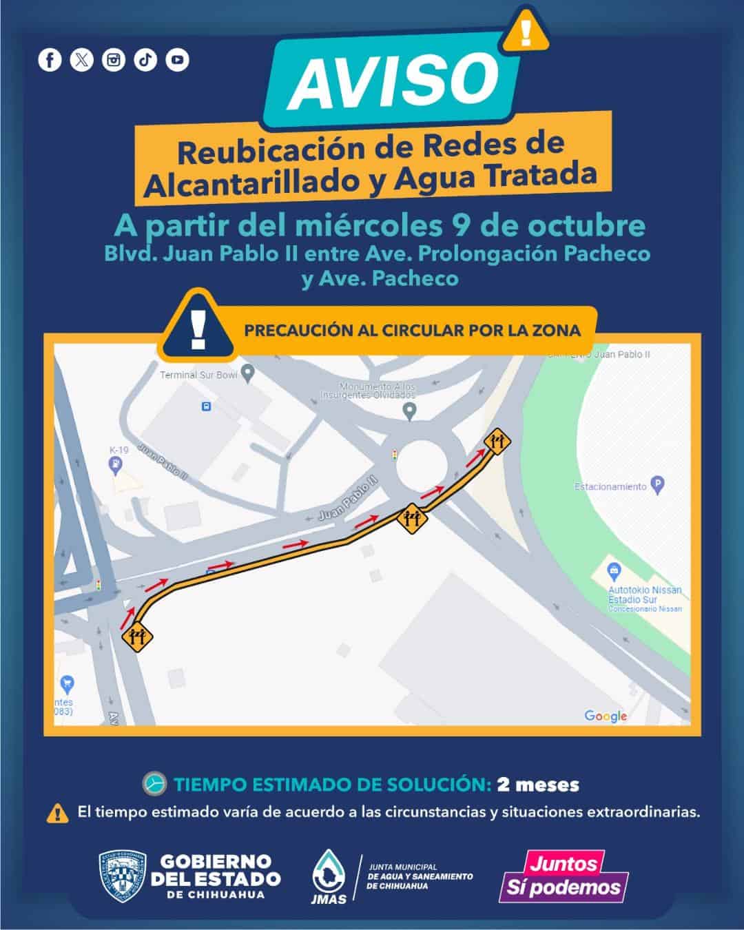 La JMAS exhorta a los automovilistas a circular con precaución por esta zona y a respetar en todo momento los señalamientos de tránsito, a fin de evitar cualquier tipo de percance. Se contempla que estos trabajos tengan una duración aproximada de dos meses.