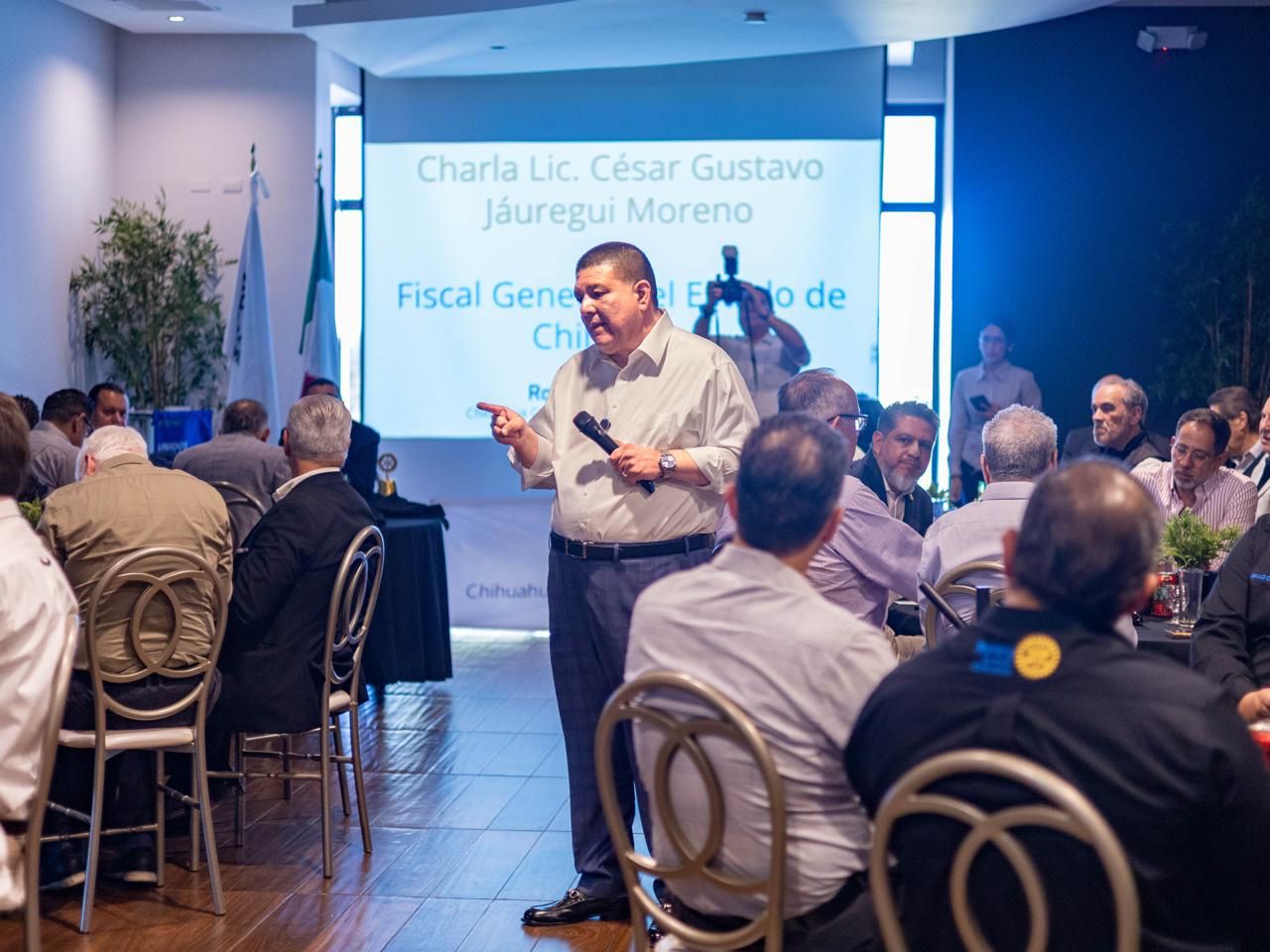 El Fiscal General del Estado, César Jáuregui Moreno, sostuvo este miércoles un encuentro con integrantes del Club Rotario Chihuahua, como parte de su estrategia de acercamiento con los distintos grupos organizados de la sociedad civil, a quienes presentó un panorama sobre la procuración de justicia en la entidad, así como los avances y logros alcanzados por la institución.