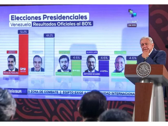 Pese a las denuncias de fraude electoral desde la oposición venezolana y a la desconfianza que diversos gobiernos en el mundo han expresado frente a los resultados que presentó la autoridad electoral, López Obrador dijo que la postura del gobierno de México entorno a Venezuela estará guiada por lo que diga el Colegio Nacional Electoral (CNE), «porque así es la democracia».