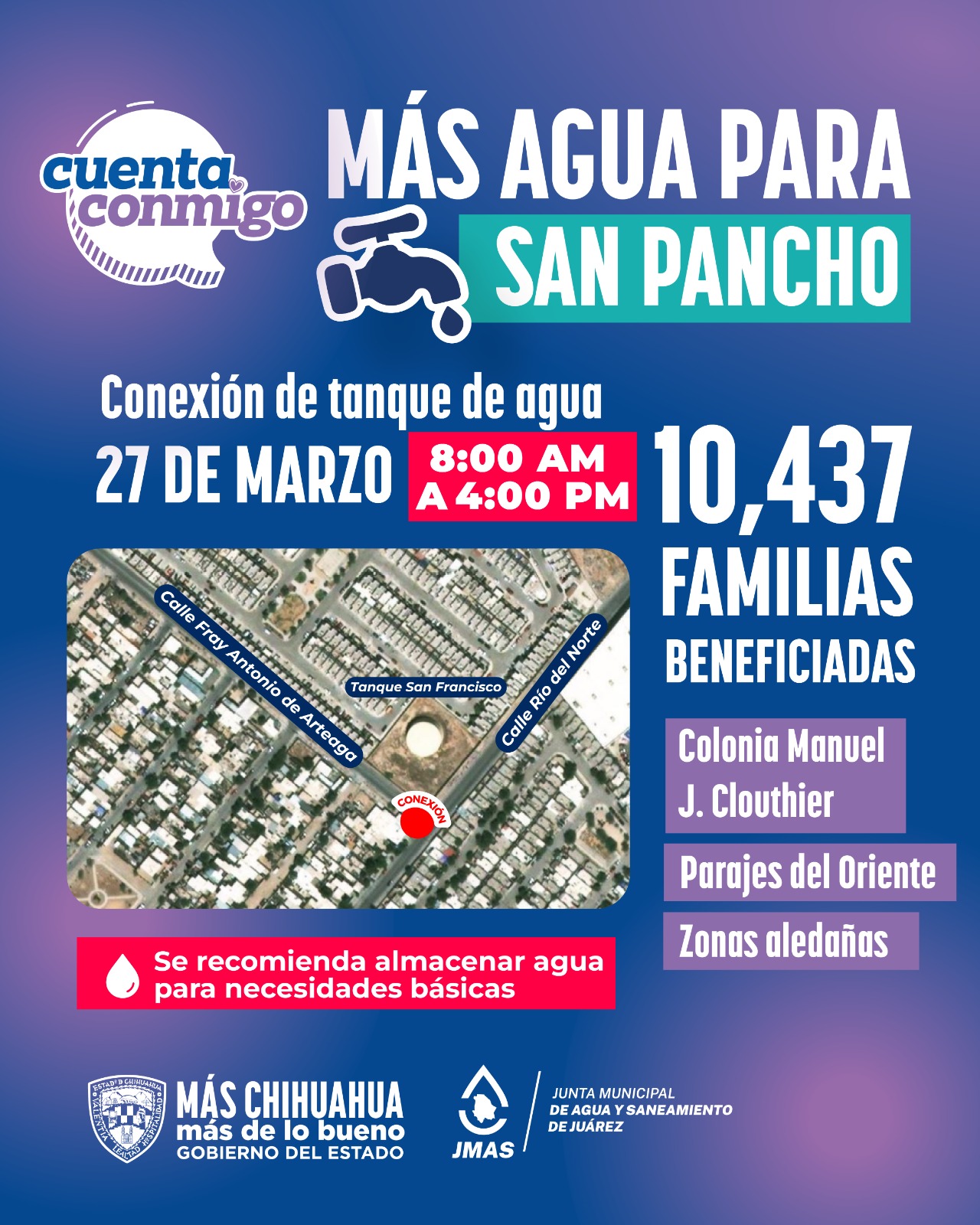 Este viernes 26 de marzo, la Junta de Agua y Saneamiento de Juárez, realizará trabajos de interconexión de una línea de conducción, proveniente de los pozos 207 y 209 hacia el tanque San Francisco, acción preventiva ante la llegada de temporada de calor para que la zona de San Pancho pueda tener más agua y mejor presión.