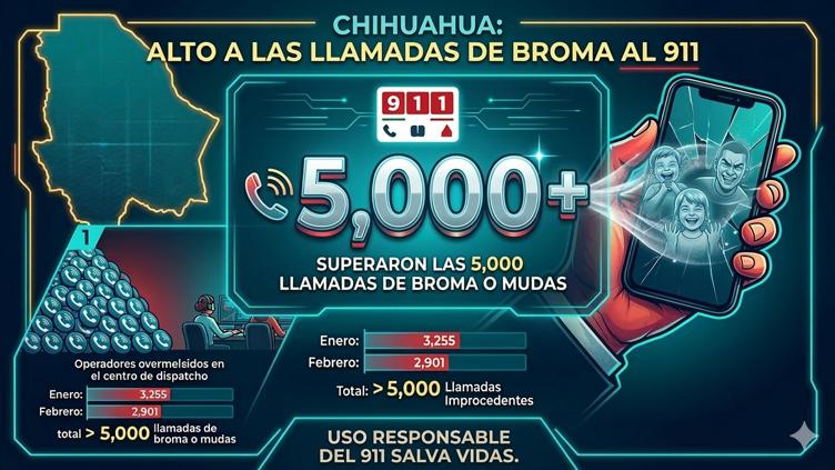 Durante enero y febrero de 2026 se registraron más de 5 mil llamadas falsas o improcedentes al 911 en Chihuahua; ante esta situación, el Congreso del Estado aprobó una reforma al Código Penal que establece sanciones de prisión y multas para quienes realicen reportes falsos al sistema de emergencias.