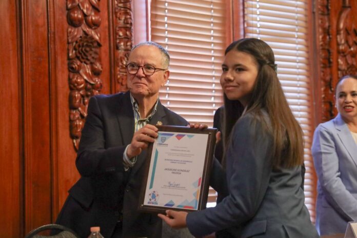 Chihuahua.- El alcalde de Chihuahua, Jorge Cruz Russek, y la alcaldesa infantil, Devanhí Azucena Gómez Robles, se sumaron a las festividades por el Día de la Niñez en el Palacio de Gobierno el pasado 30 de abril.