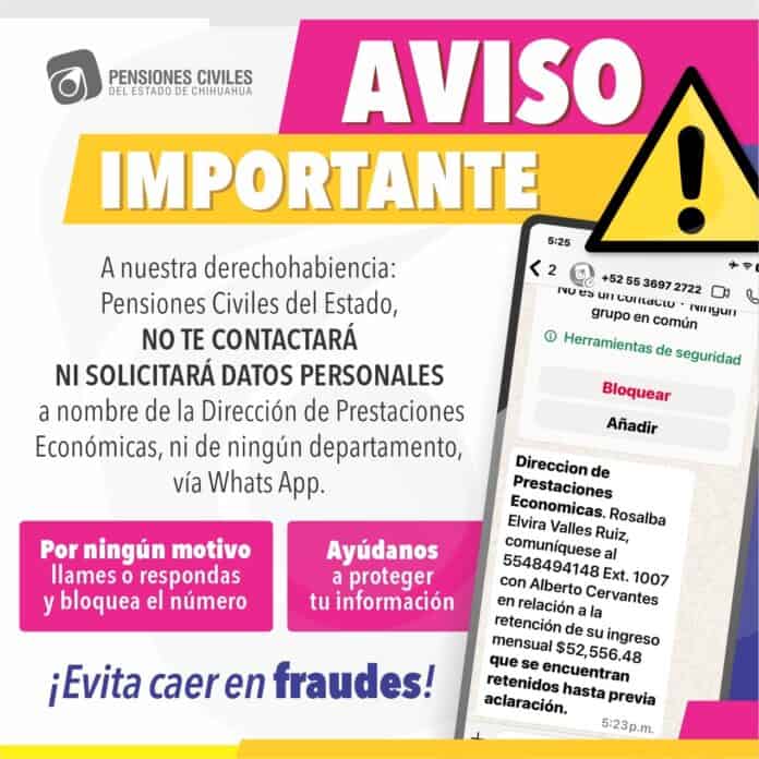 Pensiones Civiles del Estado, publicó un aviso en sus redes sociales, en donde le advierte a sus usuarios que tengan cuidado con las estafas que se están dando en nombre de la Dirección de Prestaciones Económicas.
