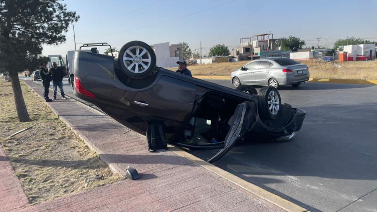 Un conductor volcó su Nissan Versa tras perder el control por exceso de velocidad en la vialidad Nogales y Sacramento; pese a lo aparatoso del accidente, no se reportaron personas lesionadas.