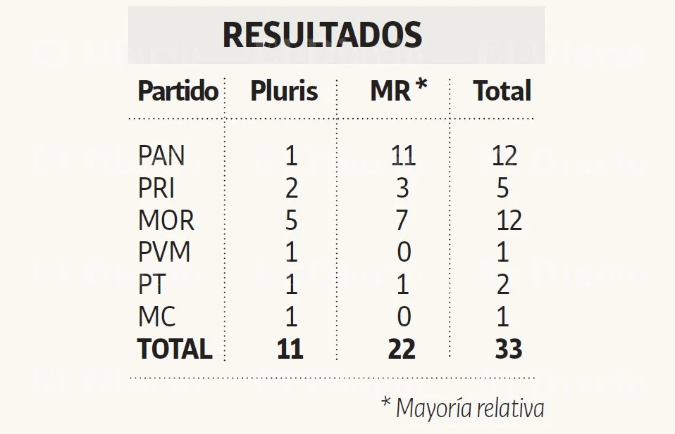 Con este reparto, contando las diputaciones de mayoría relativa que ganaron en las elecciones del pasado dos de junio, el PAN quedaría con 12 diputados y Morena también con 12; el PRI tendría 5; PT dos, y MC igual que el Verde, tendrían un diputado cada uno.