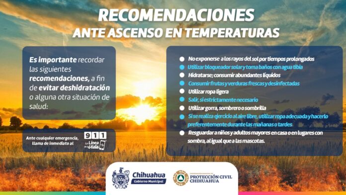 Chihuahua, Chih. A 27 de mayo del 2024.- La Coordinación de Protección Civil Municipal informa que para esta semana se pronostican temperaturas máximas de 38 °C con mínimas de 18°C.
