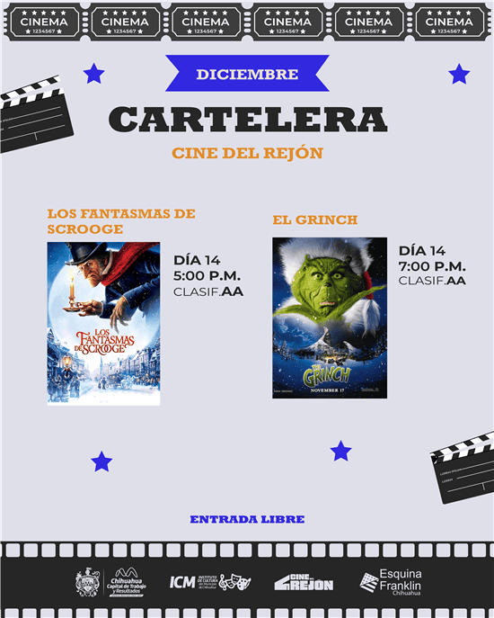 Este 14 de diciembre, el Cine del Rejón proyectará dos grandes clásicos de la temporada: “Los Fantasmas de Scrooge”, que iniciará a las 5:00 pm y “El Grinch”, programada a las 7:00 pm, ambas ideales para disfrutar en familia y vivir el espíritu navideño en un ambiente comunitario.