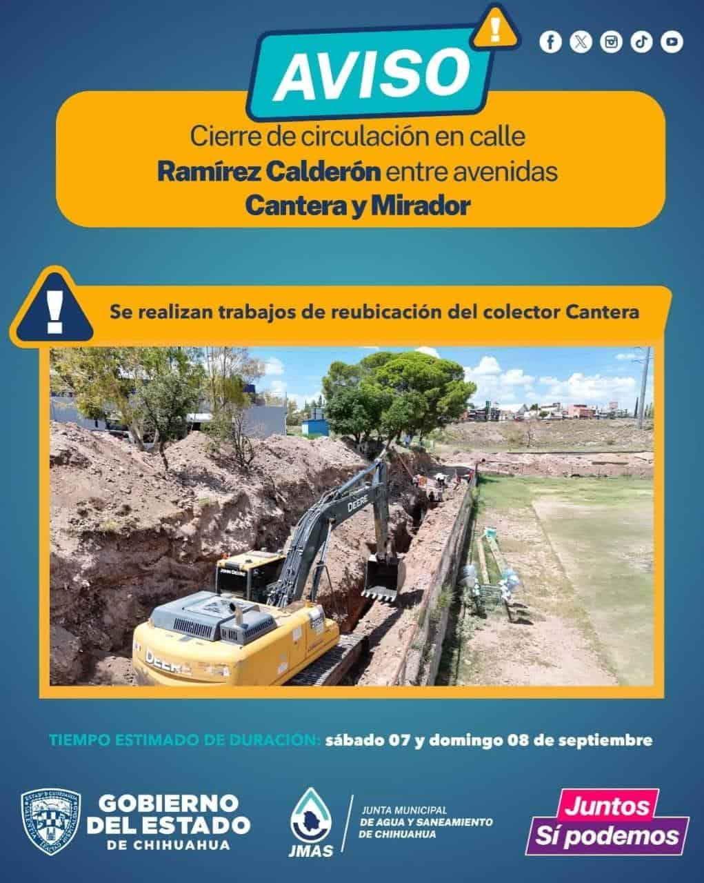 La Junta Municipal de Agua y Saneamiento (JMAS) de Chihuahua, informó que este sábado 7 y domingo 8 de septiembre, realizará obras de instalación de tubería de 30 pulgadas de diámetro en la calle Ramírez Calderón, entre las avenidas Cantera y Mirador.