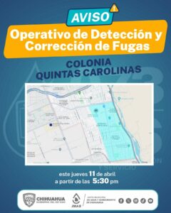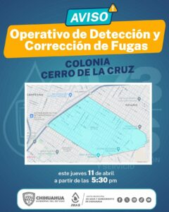 Este jueves 11 de abril a partir de las 5:30 pm, personal de la Junta Municipal de Agua y Saneamiento (JMAS) Chihuahua, realizará una serie de recorridos para detectar y reparar fugas internas en domicilios de las colonias Cerro de la Cruz y Quintas Carolinas.