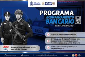 *Chihuahua, Chih. A 08 de mayo de 2024.-* Con el objetivo de cuidar los recursos de empresas o personas que, debido a la entrega de utilidades anuales, otorgarán o recibirán fuertes cantidades de dinero, el Gobierno Municipal a través de la Dirección de Seguridad Pública, ofrece el programa de Acompañamiento Bancario, por medio del cual se brinda escolta de los elementos para garantizar que los recursos lleguen seguros a su destino.