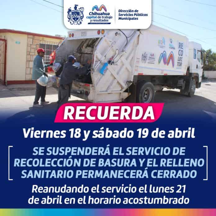 H. Ciudad de Chihuahua, Chih., a 17 de abril de 2025.- El Gobierno Municipal, a través de la Dirección de Servicios públicos Municipales, recuerda a la población en general que el servicio de recolección de basura se suspenderá este viernes 18 y sábado 19 de abril.