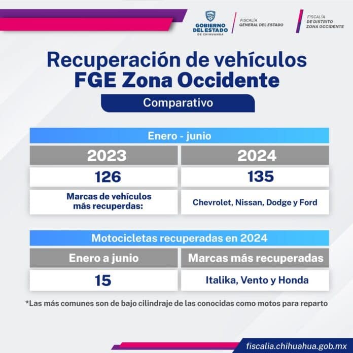 La Fiscalía de Distrito Zona Occidente, a través de elementos de la Agencia Estatal de Investigación (AEI), ha recuperado, en los primeros seis meses del año, 135 vehículos con reporte de robo.