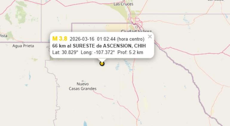 Específicamente, este movimiento telúrico ocurrió a la 1:02:44 a.m. y su epicentro estuvo dentro de campos agrícolas en los límites de los municipios referidos, lejos de cualquier mancha urbana, pero es marcado con referencia 66 kilómetros al sureste de la cabecera municipal de Ascensión.