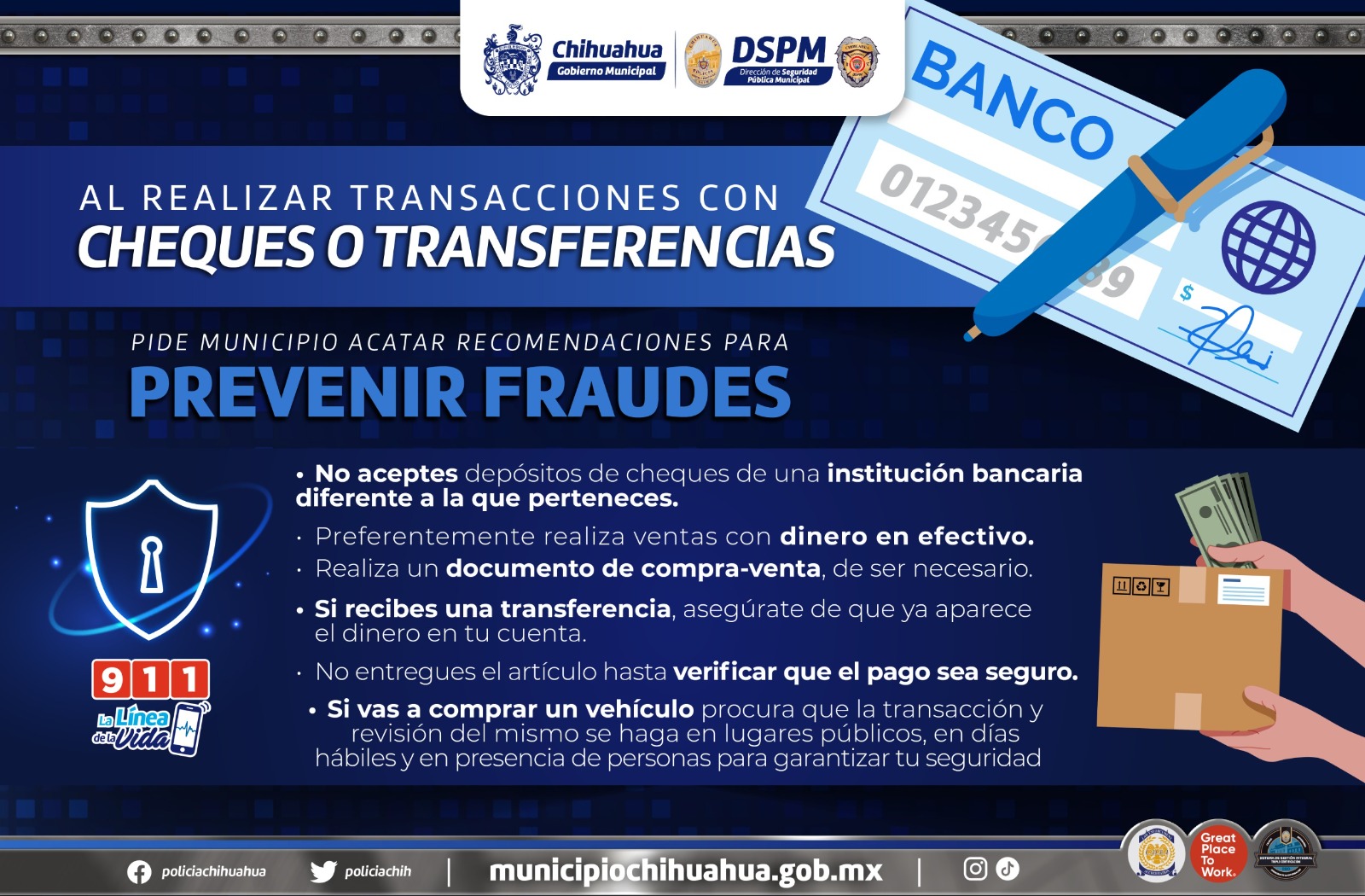 Chihuahua, Chih. A 18 de mayo de 2024.- Con el objetivo de evitar fraudes cuando se realizan transacciones personales con cheques o transferencias bancarias, la Policía Cibernética de la Dirección de Seguridad Pública Municipal, exhorta a las y los ciudadanos a ser cautelosos y asegurarse previamente de que éstos cuenten con fondos suficientes para cubrir el monto acordado.