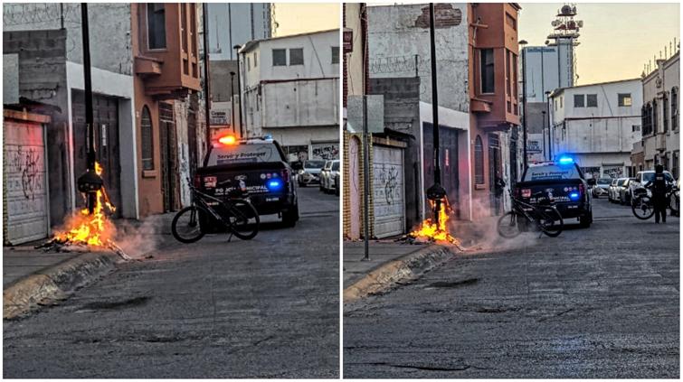 Reportes al 911 alertaron sobre el incendio en la banqueta de las calles mencionadas, llegando policías municipales para confirmaron la situación.