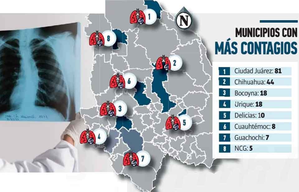 La tuberculosis mantiene presencia en al menos 18 municipios de Chihuahua, con un acumulado de 213 casos confirmados y 18 defunciones en lo que va de 2026, de acuerdo con datos de la Secretaría de Salud Estatal (SSE) al corte del 28 de marzo.
