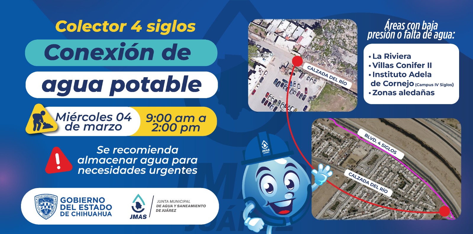 La primera intervención, será la conexión de un crucero de agua potable con tubería de 4 pulgadas, en el cruce de la calle Calzada del Río y bulevar Cuatro Siglos, trabajos que se realizarán de 9 de la mañana a 2 de la tarde.