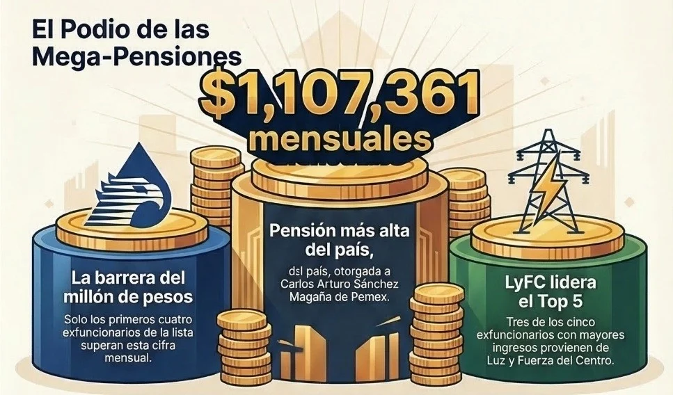 El caso más alto identificado corresponde a Carlos Arturo Sánchez Magaña, ex funcionario de Petróleos Mexicanos, quien percibe 1 millón 107 mil pesos mensuales tras haberse retirado bajo el antiguo régimen laboral de la petrolera estatal.