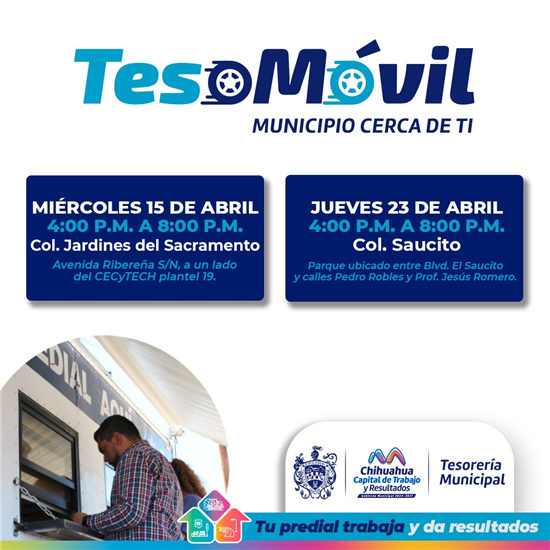 El miércoles 15 de abril, el Teso Móvil visitará la colonia Jardines del Sacramento, en la avenida Ribereña S/N, a un lado del CECyTECH plantel 19; mientras que el jueves 23 de abril estará en la colonia Saucito, en el parque ubicado entre boulevard El Saucito y calles Pedro Robles y profesor Jesús Romero.