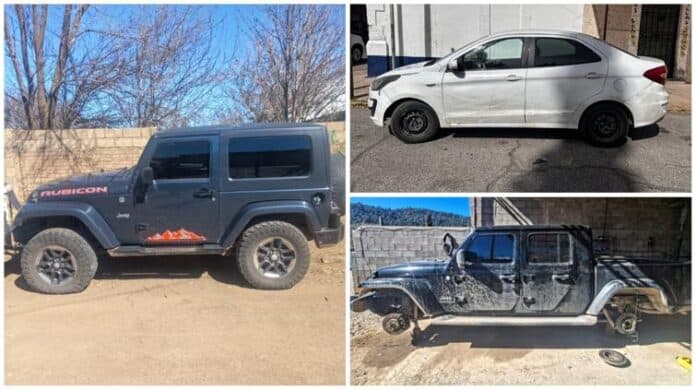 En la ciudad de Madera, sobre las calles 21 y Nicolás Bravo de la colonia Internacional, los agentes localizaron un vehículo Jeep Wrangler, modelo 2008, color azul y sin placas de circulación, el cual tenía reporte de robo interpuesto el 7 de septiembre de 2022 en Tucson, Arizona, Estados Unidos.