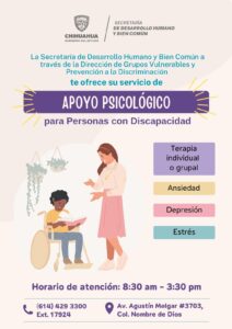 La Dirección de Grupos Vulnerables de la Secretaría de Desarrollo Humano y Bien Común, pone a disposición de la ciudadanía un servicio gratuito de apoyo y acompañamiento psicológico dirigido específicamente a personas con discapacidad, para atender las necesidades de aquellos que lo necesiten.